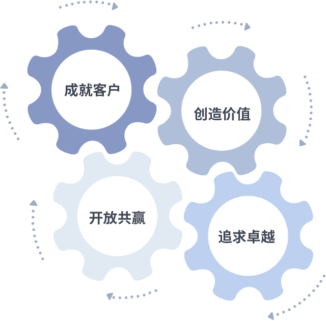 成就客户是一切决策的出发点,创造价值是衡量所有工作的标准,追求卓越是拉菲2平台做事做人的态度,开放共赢是拉菲2平台的格局也是最终的结果。价值观的齿轮环环相扣,推动着组织里的每个人不断向前。